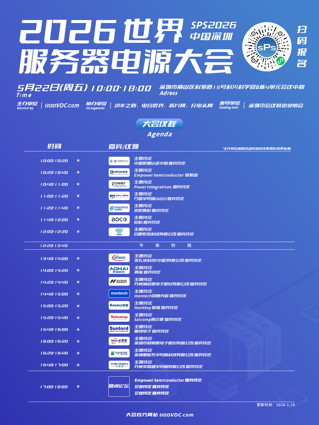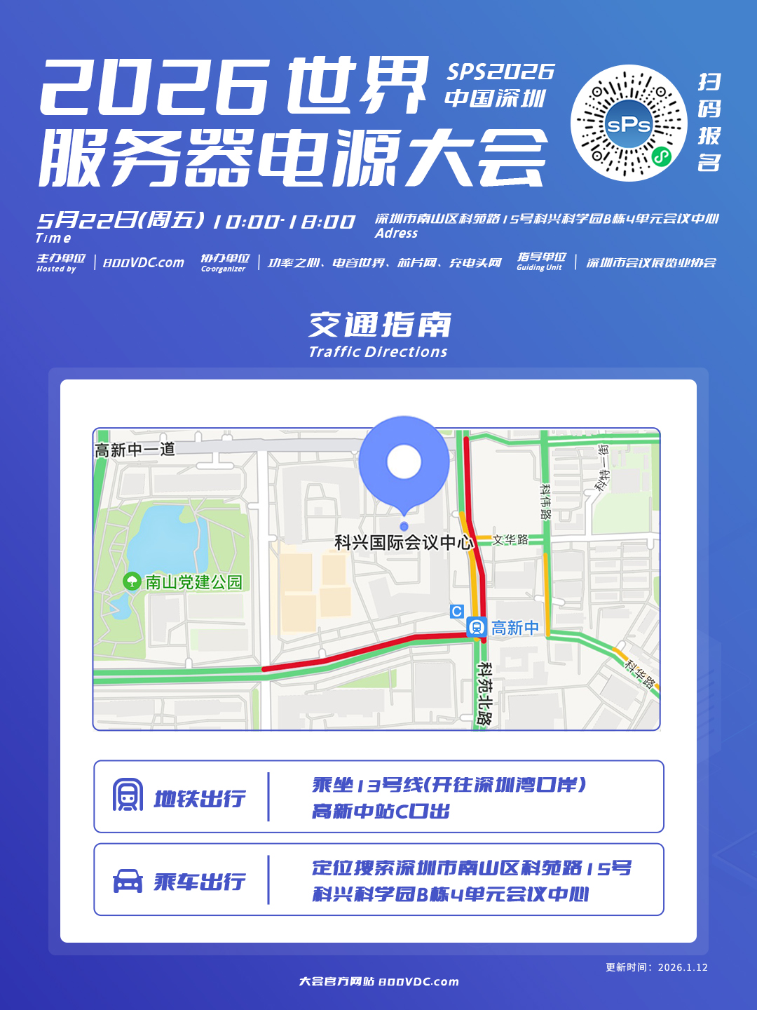 由800VDC.COM主办的2026世界服务器电源大会将于 2026 年 5 月 22 日(周五)在深圳市南山区科苑路 15 号科兴科学园 B 栋 4 单元会议中心举办。