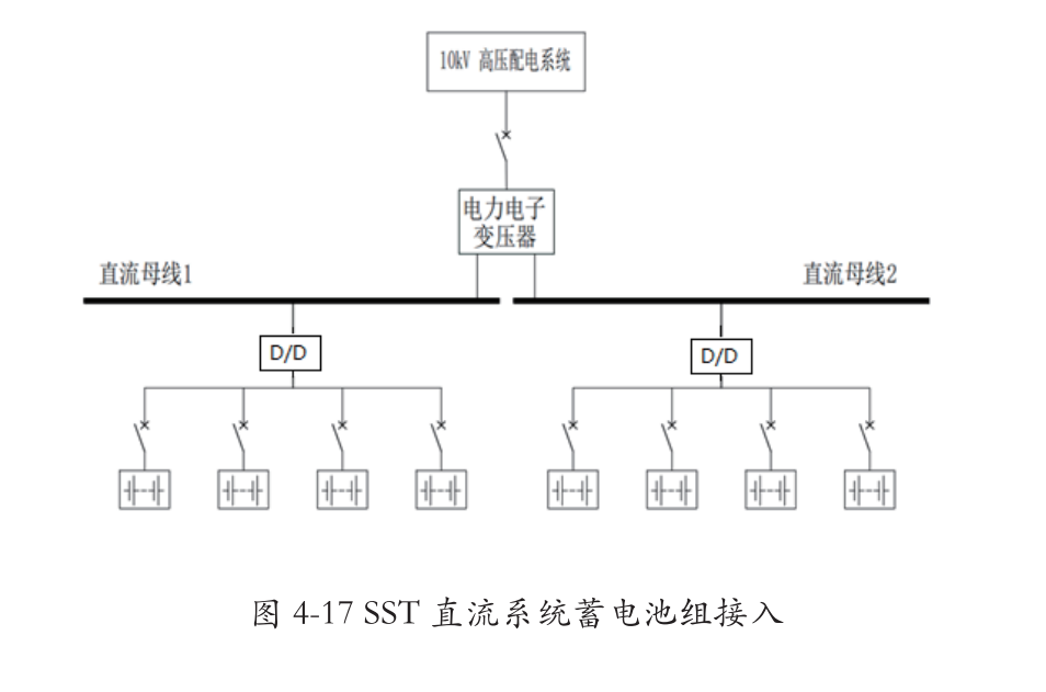 受蓄电池一致性限制,并联不宜超4组;SST为集中供电系统,可利用DC/DC并联结构设计独立支路,每个支路分别配置电池组,保障供电可靠性。