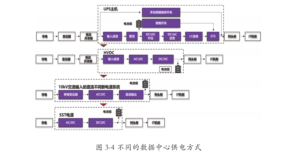 数据中心UPS低压供电系统,从10kV变压器低压绕组输出端开始,经低压配电柜、UPS、精密列头柜、PDU等设备,将电能传递至服务器电源,最终转换为低压直流为CPU、存储等组件供电。该架构供电链路长、节点多,占地面积大、供电效率低。