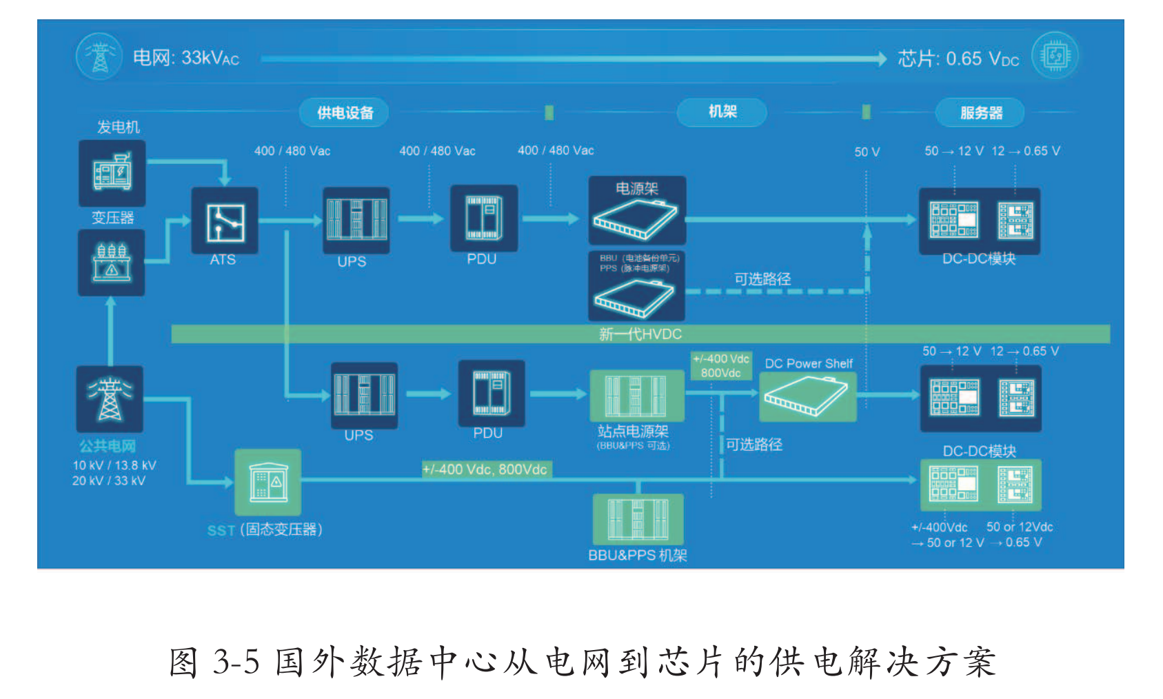 板级芯片电源已从DC12V升级为DC48V,未来将进一步升级为DC800V或±DC400V,当前可通过DC800V/±DC400V转DC48V装置实现过渡。