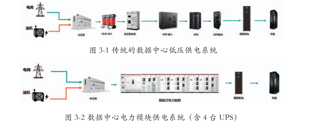近年为提升建设速度与供电效率、减少占地,预制化电力模块设备应运而生。其将低压供电系统的配电、UPS、馈线柜等集成一体,部分还包含中置柜和变压器,可实现工厂预制、一体化运输安装。测算显示,与传统低压供电系统相比,电力模块占地面积至少节省30%、建设周期节省50%、总体投资节省10%,已逐渐被用户认可。