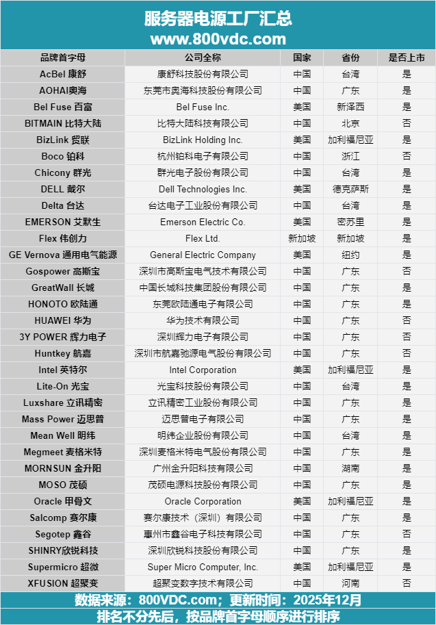 来自800VDC.com统计,以下为全球及中国地区主要的服务器电源相关企业梳理,排名不分先后,按品牌首字母顺序排列。